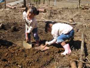 おにぎりを食べた後、小さいながらも3畝ほど作り、子供達とジャガイモの種芋75個ほど植え、初めての開墾を終えました。