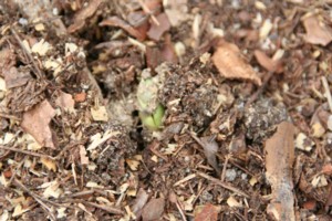 2日ほどして芽が出たのですが、早速立派なナメクジが食べている所を発見して唖然(゚o゚) ナメクジやダンゴムシが入りにくいように、カゴを地面から離しておいたのにぃ(怒)。即座に排除し、下に接する部分にナメクジよけの薬を蒔きました(泣)。