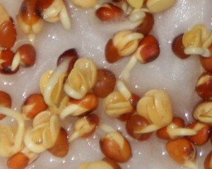 昨晩まいたかいわれ大根の種は、昨日の内に少しづつ根が始め、今朝には随分立派になりました。約24時間後には根付き始め、小さな双葉も出始めました(写真)。すこぶる順調です。