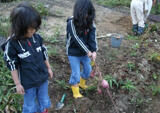 今日のサツマイモの収穫担当は子供達。一生懸命引っこ抜いて収穫してくれています。自分たちで植えた苗が育っておいもさんを収穫する、そんな普通の体験をさせてあげられる事が、収穫の量以上に嬉しく思います。ホント、この土地を購入してよかったと思います。
