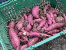 去年は苗の購入のタイミングを逃してしまったので、2年目にして初めてのサツマイモ栽培でした。見つけたのがたまたま金時で、「確か黄色くておいしい奴やな」程度の感覚で購入したのですが、どうも後で調べると金時の栽培は難しいようです。何年か前に日当たりの悪い家庭菜園で育てたフツーのサツマイモはそれなりに育ってくれたのですが、日当たりのいいはずの山の金時は結局最後まで葉茎が茂らずに終わってしまいました。収穫した芋も予想通り小さくて、買い物かご半分にもなりませんでした。今回の畝は山土部分を開墾して始めて栽培する場所だったので土作りが足りないせいも大きいかな、やっぱり山土に適した作物を選ぶべきだったのでしょう。あと、標高470mの冷涼地にはサツマイモは向いていないのかも知れません。