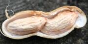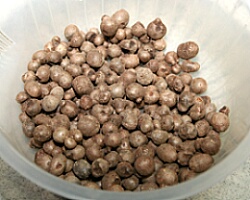 本来は収穫後、「寒ざらし」っと言って寒い中で干して乾燥させると美味しくなるそうですが、出張農園の私には無理で、1時間ほど軽く乾かして実の部分だけ持ち帰りました。それもあまりよくなかったようで、調理を担当した妻曰く、玄関先で乾かしているうちに傷んでしまったもの、実が育ってなくて空だったものなどを取り除くと、1/5ぐらいに減ってしまったようです。(苦労して剥いても4/5は無駄で、コリゴリさんだったようです)