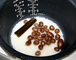「ムカゴを数時間塩水に浸けてから」なんてことを書いてあるのを見かけましたが、面倒なので少量の塩分を加えて昆布を入れ、あとは炊飯ジャーで普通に炊きました。